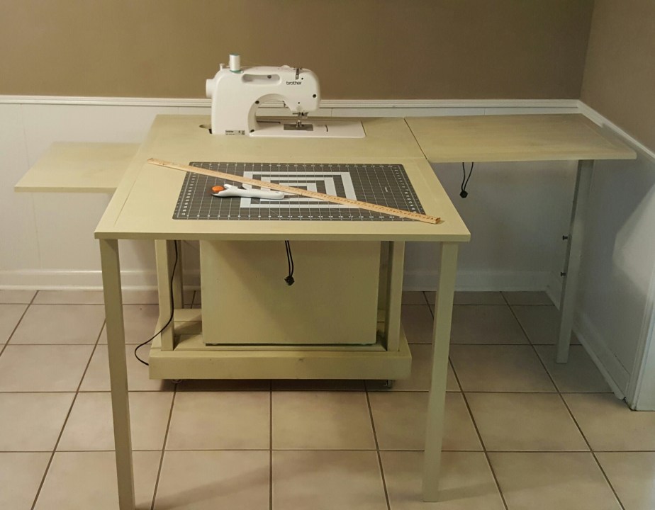 I soon realized that with my new hobby came the loneliness of confinement to the dining room, as that was the only available table.  I priced sewing tables and almost fainted at the prices I found.  A machine which cost less than $200 most certainly did not belong on a $1000 table, so I figured I would build my own.  As I often do, I was flying by the seat of my pants, a plan in mind and even a sketch with measurements, but the seat of my pants nonetheless.  I wanted somewhere to keep the machine without constantly having to move it out of the way and would allow me to still be in the same room as the rest of my family.  Here’s what I came up with: